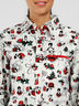 Рубашка прямого силуэта с отложным воротом застегивается на пуговицы. Нагрудный кармашек. Украшена принтами.