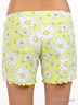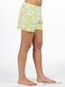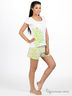 Оригинальная пижама из эластичного трикотажа. Кофта имеет круглый вырез; короткий рукав; декорирована оригинальной аппликацией. Шорты посажены на резинку, декорированы оригинальным принтом.