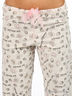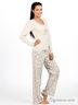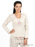 Оригинальная пижама из эластичного трикотажа. Кофта имеет круглый вырез; длинный рукав; декорирована оригинальной аппликацией. Брюки посажены на резинку, декорированы оригинальными аппликациями. Завязываются на ленточку на поясе.
