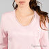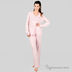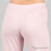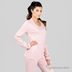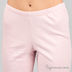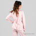 Мягкая пижама нежного цвета. V-образный вырез кофты и манжеты рукавов отделаны бархатистой резинкой с тесьмой-кружевом. Слева на кофточке – декоративная нашивка-логотип. Пояс брюк на эластичной резинке не будет впиваться и причинять неудобства.