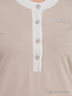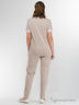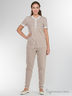 Туника с коротким рукавом и брюки. Вырез горловины округлый, спереди короткая планка с застёжкой на пуговицы. На груди логотип марки "Lunatiсa" выполненный из страз. В области бёдер кулиска с поясом. Отделка на рукавах, планка и пояс из ткани в мелкую полоску. Брюки зауженные к низу, длинные, подходят на рост до 180 см.