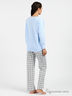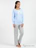 Теплая комфортная пижама. Лонгслив с округлым вырезом и длинным рукавом с заниженной проймой выполнен из мягкого футера, декорирован принтом на полочке. Рукав и низ изделия на манжете из трикотажной резинки. Брюки с рисунком - клетка на резинке.