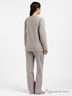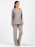 Комфортная пижама из тонкого слегка эластичного трикотажа. Лонгслив с длинным рукавом и округлым вырезом, окантованным лентой с рисунком и атласным бантиком. Прямые брюки с рисунком-горох на резинке.
