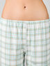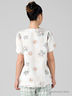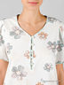 Изящная пижама из приятного на ощупь трикотажного материала с принтом. Хлопок позволит Вам чувствовать себя комфортно, а тело будет дышать. Короткие рукава кофты имеют свободный крой внахлест. Круглый вырез дополнен пуговицами. Низ кофты декорирован оборками. Прямые и свободные брюки с поясом на эластичной резинке. Изюминка этой модели – применение разного принта для декорирования кофты и брюк пижамы.