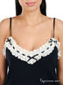 Майка прямого кроя. V-образный вырез, нерегулируемые лямки. Вырез и подол декорированы кружевом с продетой атласной лентой.