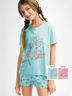 Шортики модели с неровным краем, украшены звездами, а верхняя часть с коротким рукавом и изображением забавной феи.