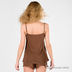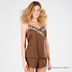 Комплект одежды для сна выполнен из приятной на ощупь вискозы шоколадного цвета. Майка свободного кроя на тонких регулируемых бретелях. V-образный вырез декорирован изящной сеточкой-кружевом с шитьем и атласным бантиком. Короткие шортики с эластичным поясом на резинке. Бретели, верхний край спинки, низ майки и шортиков отделаны декоративной тесьмой.