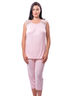 Пижама женская из однотонного вискозного трикотажного полотна. Топ с отрезной кокеткой по переду украшен узким кружевом биколор, на груди- мягкая сборка. Широкое плечо из кружева, горловина и пройма обработана обтачкой из полотна. Силуэт расширенный к низу, длина до бедра. Капри из однотонного вискозного трикотажного полотна, длина до середины икры, пояс на резинке.