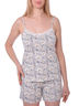 Пижама женская. Топ на тонких бретелях, верхний срез украшен узким ажурным кружевом. Силуэт полуприлегающий, слегка расклешенный к низу. Шорты короткие на резинке.