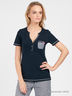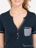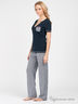 Детали: v-образный вырез горловины, застежка на пуговицы, короткий прямой рукав, декоративный кармашек, брюки на резинке декорированы трикотажной лентой