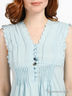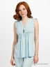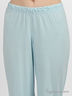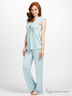 Пижама с застёжкой из ряда пуговиц, обтянутых атласной тканью, с воздушными петлями. Отделана защипами под грудью, рядами шитья. Брюки на резинке.