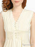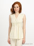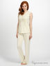 Пижама с застёжкой из ряда пуговиц, обтянутых атласной тканью, с воздушными петлями. Отделана защипами под грудью, рядами шитья. Брюки на резинке.