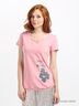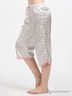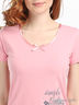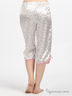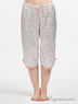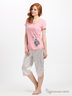 Футболка с коротким рукавом, по низу принт с вкраплением мелких страз. Кантики из атласной тесьмы, на груди тонкий атласный бантик, по низу трикотажные кружева. Капри на резинке, по низу кружево.