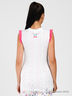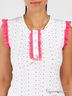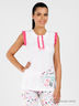 Футболка прямого силуэта с округлым вырезом горловины и коротким сетчатым рукавом. Застежка на четыре кнопки на полочке. Полочка украшена аппликациями и вышивкой.