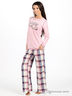 Детали: кофта с круглым вырезом и длинным рукавом; декорирована аппликациями, нашивками и контрастной прострочкой; брюки посажены на резинку; завязываются на ленту на поясе; декорированы оригинальным принтом - клетка