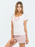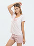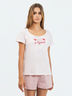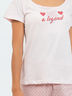 Очаровательная я пижама из контрастных полотен, состоящая из футболки и шорт. Футболка свободного силуэта с принтом "Be a legend" на полочке. Шорты прямого фасона на поясе с мелким принтом "сердечки".