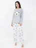 Уютный костюм из велсофта, состоящий из джемпера и брюк. Джемпер прямого силуэта с длинными рукавами. Полочка декорирована объемной нашивкой "коала" с пайетками. Брюки контрастного цвета с принтом "коала" прямого фасона, комфортной посадки, пояс с резинкой.
