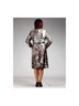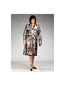 Стильный женский плащ из гладкой ткани с оригинальным принтом. Отложной воротник с лацканами. Застежка на пуговицы. Два прорезных кармана с клапанами на пуговицах. Длинные прямые рукава. Талия подчеркнута поясом.