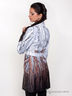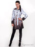 Оригинальный плащ из гладкой ткани с эффектным принтом. Стояче-отложной воротник. Застежка на пуговицы. Длинные прямые рукава со вставками на манжетах. Два накладных кармана. Талия подчеркнута широким поясом.
