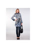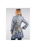 Модный женский плащ из гладкой ткани с эффектным набивным рисунком. Широкий отложной воротник с лацканами. Застежка на пуговицы. Длинные рукава с манжетами на пуговицах. Два прорезных кармана. Талия подчеркнута поясом, закрепленным шлевками.