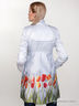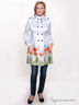 Эффектный плащ с завышенной талией из гладкой ткани с оригинальным печатным рисунком. Воротник- стойка. Плечи декорированы погонами с пуговицами. Отрезной лиф с кокеткой на полочках и на спинке. Двубортная застежка на пуговицы. Длинные прямые рукава с патами на запястьях.