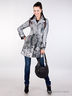 Модный женский плащ из гладкой ткани с эффектным набивным рисунком. Широкий отложной воротник с лацканами. Застежка на пуговицы. Длинные рукава с манжетами на пуговицах. Два прорезных кармана. Талия подчеркнута поясом, закрепленным шлевками.