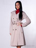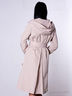 Женский плащ из шелковистой ткани с легким отливом. Приталенный силуэт. Двубортная застежка на пуговицы. Линия талии подчеркнута поясом с пряжкой. Широкий капюшон. На спинке встречная складка.