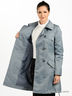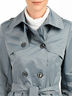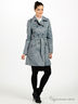 Детали: плащ - тренч, втачной отложной воротник на стойке у основания горла застегивается на хлястик с пуговицей, модель чуть выше колена, двубортность, пояс из основного материала и шлевки для пояса, застежка на пуговицах, рукав длинный двухкроеный заужен к запястью, два врезных боковых кармана с листочком на пуговице, небольшие погоны на плечах в качестве отделки.