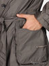 Детали: воротник стойка, застежка на пуговицы, спереди два накладных кармана, талия подчеркнута поясом, внутри шелковистый подклад и два втачных кармана на пуговице, сзади разрез-шлица