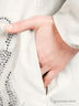 Детали: отложной воротник стойка, застегивается на пуговицы, спереди 2 прорезных кармана, талия со шлевками на поясе, изделие украшено оригинальными нашивками со стразами