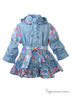 Легкий красивый плащ приталенного силуэта-надёжная защита от дождя и ветра для Вашей девочки. Капюшон, два прорезных кармана спереди, модель декорирована вставками с цветочным принтом и оборками.