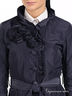 Детали: воротник стойка с рюшами, застегивается на пуговицы, спереди 2 прорезных кармана на кнопке, полочка украшена декоративными розами, талия подчеркнута поясом