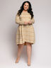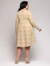 Платье бежевое свободного кроя с длинными рукавами и белым принтом.