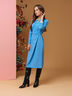 Платье небесно-голубого оттенка в мелкий горошек придаст вашему образу элегантности и изящества. V-образный вырез и пояс из основной ткани расставят правильные акценты.