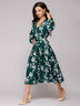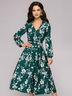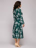 Платье изумрудное с принтом длины миди с глубоким вырезом.