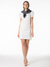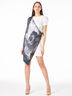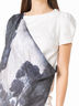Платье полуприлегающего силуэта. Палантин закреплен на плече. Его можно укладывать шарфом, используя петельку на другом плече или пуговицу на боковом шве или поясок. Ткань платья плотная с благородным отливом. Застежка на молнию сбоку.