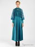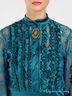 Детали: ворот-стойка, застежка на кнопки, длинный рукав на высокой манжете, полочка декорирована рюшами и несъемной брошью