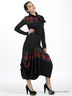 Детали: ворот-хомут, присборенный длинный рукав, полочка декорирована тканевой брошью, фигурные вытачки, ассиметричный подол с завязками, в комплекте бусы
