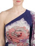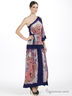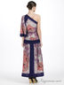 Длинное летнее платье из гладкого материала. Слегка расклешенного кроя, широкий рукав 3/4 на одно плечо. Талия завязывается на тонкую веревочку, украшено оригинальным принтом.