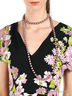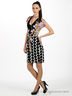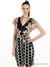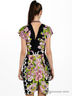 Детали: глубокий V-образный вырез на спине и на лицевой стороне. рукав короткий силуэта кимоно, пришитый пояс присборен хлястиком завязывается на спине, юбка присборена, снизу изделия разрез, платье выполнено в расцветке под горошек с цветами.