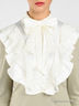 Детали: отложной воротник, застежка на кнопки до середины изделия, длинный прямой рукав с атласной манжетой, полочка декорирована атласным жабо с кружевными вставками. В комплекте съемный бант.