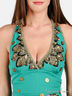 Детали: застежка на молнию на боку, отрезной лиф с бретелью-петлей, изделие активно декорировано металлическими элементами, пайетками и бисером
