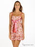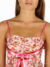 Летнее игривое платье расклешенного кроя из струящейся ткани. Тонкие регулирующиеся бретельки. Лиф декорирован яркой атласной лентой. На спине лиф собран многорядной резинкой. Юбка-баллон, внутренний слой атласный, внешний- тонкий шелк.