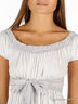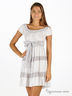 Платье с расклешенным кроем из тонкого трикотажа. Широкий круглый вырез горловины отделан тканью другого цвета, присборен резинкой. Короткие рукава присборены. На юбке вставки из ткани с рисунком. Платье дополняется шарфиком, который также можно повязать на талии.