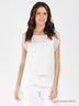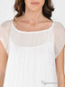 Детали: округлый вырез горловины присборен на резинку, короткий рукав-реглан, низ изделия декорирован кружевной тесьмой