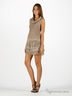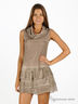 Платье расклешенного книзу кроя из тонкой ткани. Ворот-хомут. Передняя часть изделия декорирована тонкой сеточкой с вышивкой. Многослойная юбка.