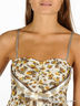 Летнее игривое платье расклешенного кроя из струящейся ткани. Тонкие регулирующиеся бретельки. Лиф декорирован яркой атласной лентой. На спине лиф собран многорядной резинкой. Юбка-баллон, внутренний слой атласный, внешний- тонкий шелк.