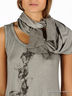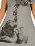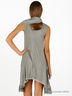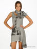 Платье расклешенного кроя из тонкого трикотажа, проймы горловины и рукавов отделаны трикотажной резинкой. Внизу по бокам вставки из шелковой ткани. К платью прилагается пояс в том же стиле с шелковыми вставками.
