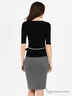 Мягкое платье из джерси прилегающего силуэта с округлым вырезом горловины и с укороченным прямым рукавом. В комплекте великолепные бусы под жемчуг, декорированные атласными лентами. Такое платье придает нотку изысканности и очарования.