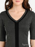 Детали: V-образный вырез горловины, укороченный рукав, низ изделия - трикотажная резинка, контрастная вставка по вороту и на полочке